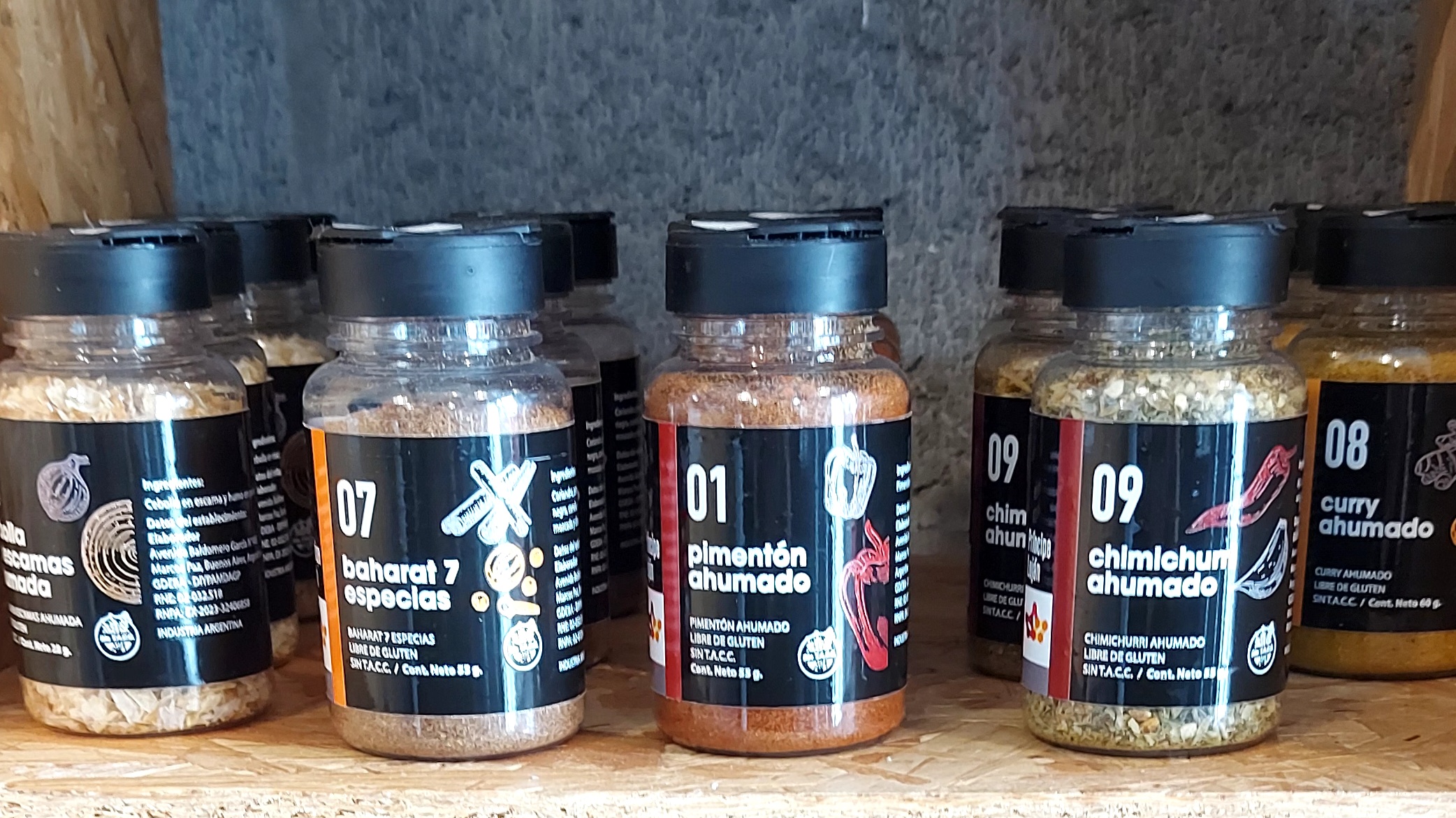 Variedad de condimentos libres de gluten, en envases especieros de 55 gr.
